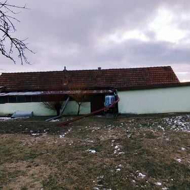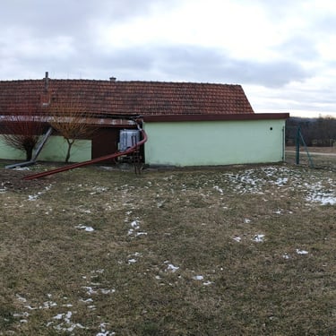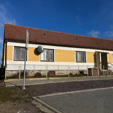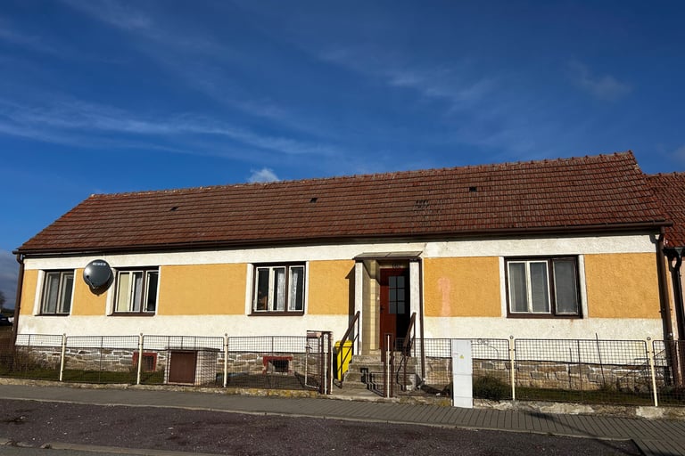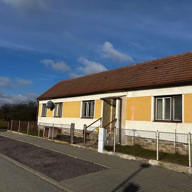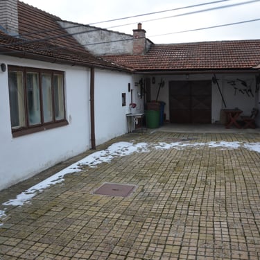 Koncový řadový rodinný dům postavený v roce 1961. Nemovitost tvoří dům ( 137 m2 ) , hospodářská část s garáží (122 m2 ) a zahrada 399 m2. V prostoru mezi domem a hospodářskou částí se nachází uzavřené atrium s krytým parkovacím stáním o zast.pl. 90 m2. Obytná část sestává ze 3. pokojů, kuchyně, koupelny, WC, chodby, verandy a spíže (vše 90 m2 ). V suterénu je plynový kotel ÚT. Ohřev TUV do koupelny a kuchyně. Nemovitost se nachází na okraji obce a je napojena na elektřinu, plyn, vodovod a kanalizaci. Celková výměra všech pozemků je 832 m2.